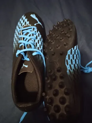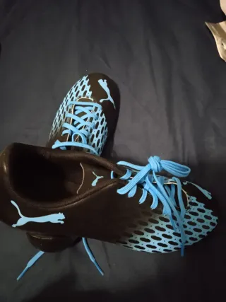 Zapatillas de fútbol Puma con tacos. - Diseño en negro y azul. - Cordones de color azul. - Logo de Puma en los laterales y la lengüeta.