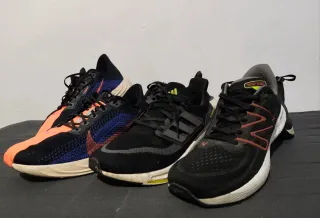 Leer descripción Pack de tres zapatillas deportivas de diferentes marcas. Todas originales. - Zapatilla Nike zoom Pegasus plus con detalles en naranja y azul. Talla 45 - Zapatilla Adidas ultraboost negra con detalles grises. Talla 45.5 - Zapatilla New Balance fresh foam negra con detalles en rojo. Talla 45 Zapatillas presentan algun roce. Por lo demas estan para utilizar por mucho más tiempo. NO NEGOCIABLE!!!