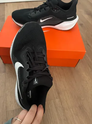 Zapatillas de correr Nike Pegasus en color negro con detalles blancos. Diseñadas para ofrecer comodidad y rendimiento. - Parte superior de malla transpirable. - Suela con amortiguación Air Zoom. - Cierre de cordones. - Logo de Nike en el lateral. Están prácticamente nuevas, las habré usado unas 5 veces únicamente.