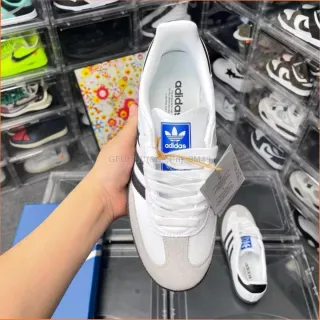 Zapatillas Adidas Samba clásicas en talla 37. Combinan blanco y gris con las icónicas tres franjas negras. - Diseño atemporal. - Materiales de calidad.