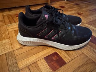 Zapatillas deportivas Adidas para mujer. - Diseño en color negro con detalles en rosa. - Tres rayas icónicas de Adidas en el lateral. - Suela blanca. - Logo de Adidas en la lengüeta y la plantilla. - Muy poco uso (puestas solo dos o tres veces).