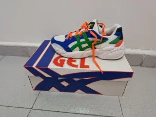 Zapatillas deportivas Asics Gel con un diseño vibrante y moderno. - Combinación de colores blanco, azul, verde y naranja. - Cordones de color naranja. - Suela blanca.