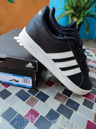 Zapatillas deportivas de la marca Adidas modelo Grand court base en color negro con detalles blancos. - Diseño clásico con las tres franjas. - Cierre de cordones. - Suela de goma.