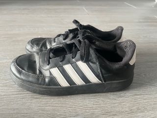Zapatillas deportivas Adidas en color negro con detalles blancos. - Diseño clásico de tres rayas. - Cierre con cordones.