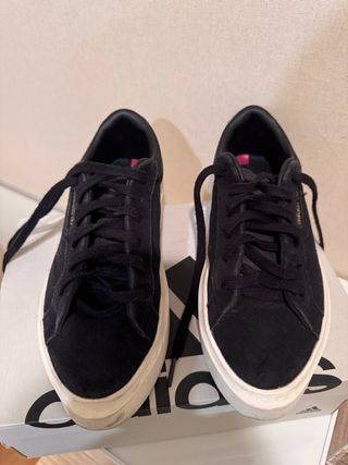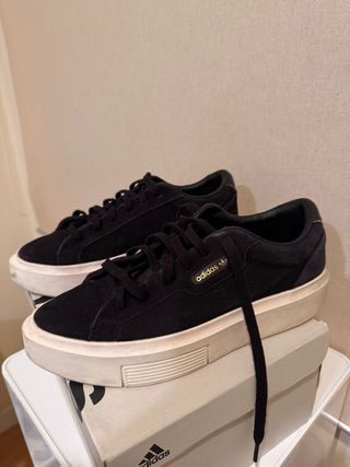 Zapatillas deportivas Adidas con un diseño moderno y detalles dorados. - Exterior de ante negro. - Suela de plataforma blanca. - Detalle del logo Adidas en dorado.