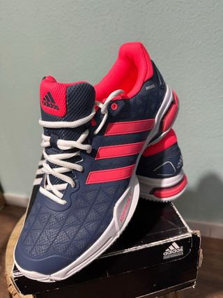 Zapatillas deportivas Adidas en talla 42. Combinan blanco, azul y detalles en rosa para un look moderno. - Diseño deportivo. - Cierre con cordones blancos. - Suela de goma.