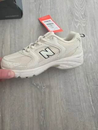 Zapatillas deportivas New Balance modelo 530. - Diseño en tonos beige y blanco. - Logo 'N' característico en el lateral. - Cierre con cordones.