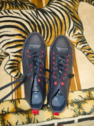 Zapatillas deportivas altas de color negro con cordones y ojales en contraste rojo. - Diseño de caña alta. - Cordones negros. - Ojales rojos. - Suela negra.