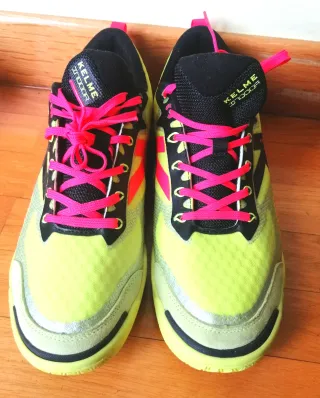 Zapatillas de fútbol sala KELME modelo Precision Indoor Stiletto Profesional de Número 42 Totalmente nuevas sin estrenar. Forro interior acolchado. Empeine ancho y cómodo. Color amarillo flúor muy bonitas. Refuerzo delantero. Mira mi perfil que tengo publicadas alguna más. Cualquier duda, pregunta. - Diseño llamativo en amarillo y detalles en rosa. - Cordones de ajuste en color rosa. - Logo de la marca en la lengüeta.