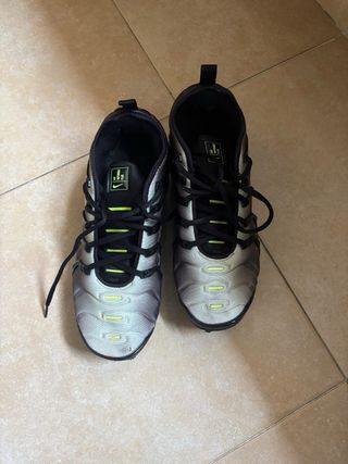 Zapatillas deportivas Nike Air VaporMax Plus en tonos plateados y negros. - Diseño moderno y llamativo. - Cordones negros. - Detalle de color neón en los ojales.