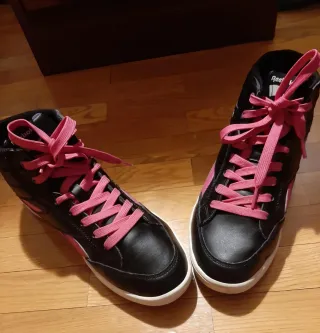 Zapatillas deportivas Reebok de caña media. - Diseño moderno en negro con detalles en rosa. - Cierre con cordones. - Logo de Reebok en el lateral.