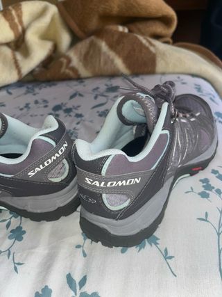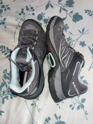 Zapatillas de senderismo Salomon en tonos grises y turquesa. Perfectas para actividades al aire libre. - Diseño deportivo. - Cierre con cordones. - Detalle de logo en el lateral. Zapatillas de mujer Salomon con uso pero en muy buen estado, la suela perfecta. Las vendo porque no las uso y me ocupan en el armario Perfectas para rutas Botas de montaña bajas para mujer Talla 37 1/3 clmo indica en la foto