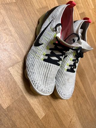 Zapatillas deportivas Nike Vapormax Flyknit con un diseño moderno y cómodo. - Parte superior de tejido Flyknit transpirable. - Suela con amortiguación Vapormax. - Cierre con cordones negros. - Detalles en color lima y rojo.
