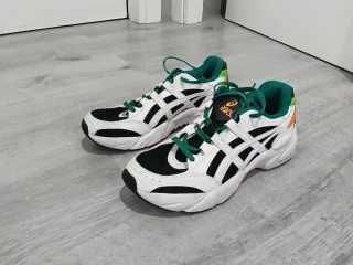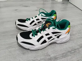 Zapatillas deportivas Asics con tecnología GEL, ideales para running. Puestas 1 vez - Diseño moderno en blanco y negro. - Detalles en verde y naranja. - Cordones verdes a juego.