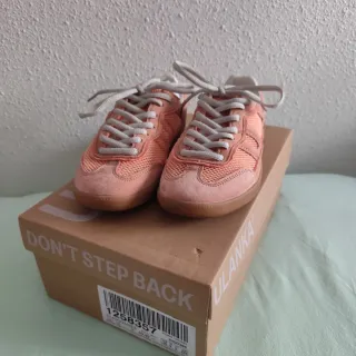 Zapatillas deportivas New Balance con un diseño moderno y cómodo. - Tallas 37-38 - Combinación de colores beige y rosa. - Logo distintivo de la marca en el lateral.