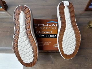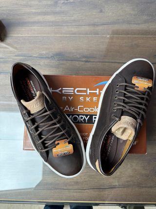 Zapatillas Skechers de cuero color marrón, con tecnología Air-Cooled y plantilla Memory Foam. - Diseño deportivo. - Cierre de cordones. - Suela de goma.