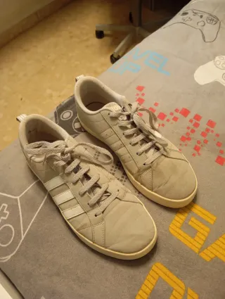 Zapatillas deportivas de la marca Adidas en tonos beige y blanco. Perfectas para el día a día. - Diseño clásico con las tres rayas. - Cierre con cordones.