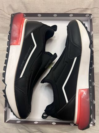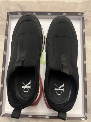 Zapatillas deportivas Calvin Klein en color negro y detalles en rojo. Perfectas para el día a día. - Diseño sin cordones. - Logo de la marca en la plantilla. - Suela con contraste de color.