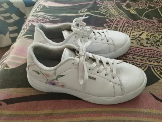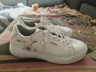 Zapatillas deportivas Joma con un diseño floral. - Apenas usadas en perfecto estado - Color blanco con detalles de flores en tonos morados, rosas y naranjas. - Cierre con cordones. - Logo de la marca Joma en el lateral.