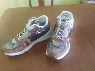 Zapatillas deportivas en tonos grises y blancos. Ideales para un look casual y cómodo. - Diseño moderno y elegante. - Suela gruesa y cómoda. - Perfecto estado.