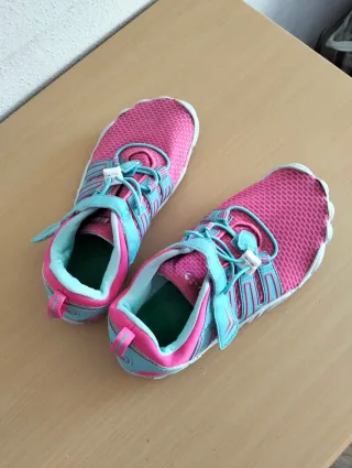 Zapatillas deportivas planas con un diseño moderno y llamativo. - Combinación de colores rosa y azul. - Cierre con cordones elásticos y velcro. - Tirador trasero para facilitar su colocación. - Muy poco uso. Usadas únicamente para entreno. - Vienen con su funda original.