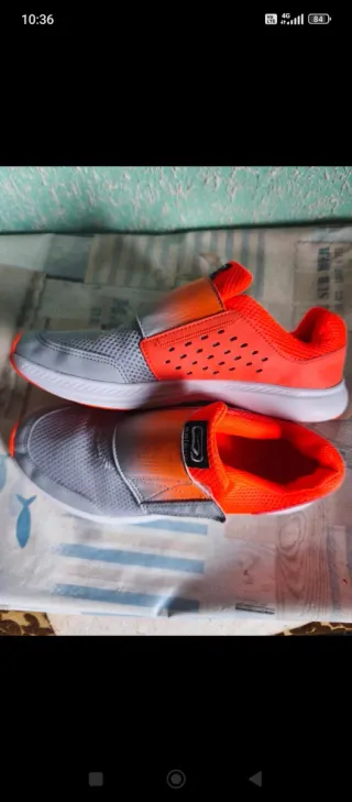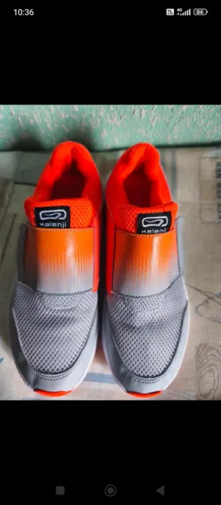 Zapatillas deportivas de la marca Kalenji en talla 39. Combinan tonos grises y naranjas con un diseño moderno. - Cierre sin cordones. - Parte superior de malla transpirable. - Detalle de logo en la lengüeta.