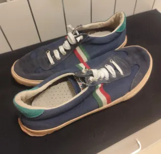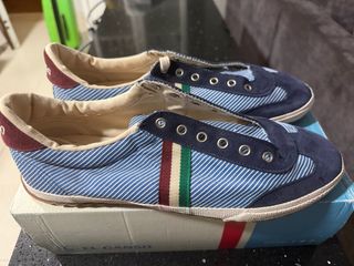 Zapatillas deportivas con un diseño llamativo y detalles de colores, el Ganso, N° 42, usadas pero bien conservadas, tal cual foto. - Tira tricolor (rojo, blanco, verde) en los laterales. - Puntera y talón reforzados en ante azul marino.