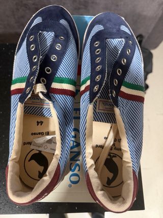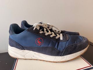 Zapatillas de la marca El Ganso en talla 44. Combinan tonos azules con detalles en rojo y blanco. - Diseño deportivo. - Cordones de color crudo. - Logo de El Ganso en la lengüeta. - Estampado de delfín en la plantilla.