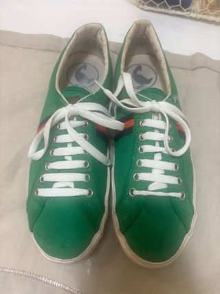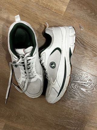 Zapatillas de la marca El Ganso en color blanco con detalles verdes. Tienen un pequeño roto en una de ellas como se aprecia en las fotos. Por lo demás están perfectas como se aprecian. - Diseño clásico. - Cordones blancos. - Suela de goma.
