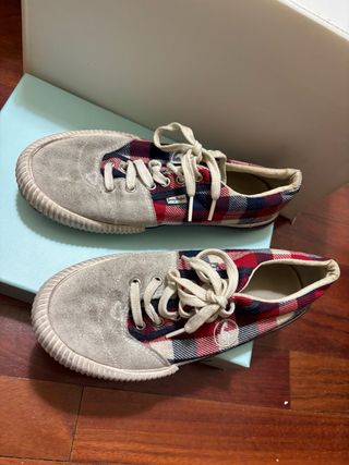 Zapatillas de la marca El Ganso con un diseño de cuadros. - Combinación de colores azul y rojo. - Parte superior de ante y tela. - Cordones blancos.