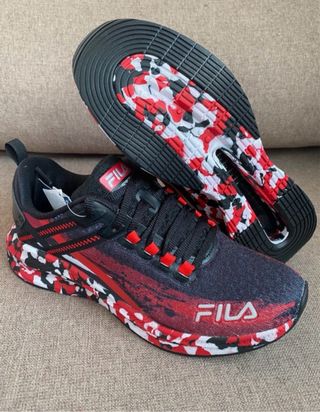 Zapatillas deportivas running Fila con un diseño moderno y llamativo. Tallas disponibles 43 y 44 Nuevas con su caja original. - Combinación de colores negro y rojo. - Estampado camuflaje en la suela. - Cordones negros con detalles rojos.