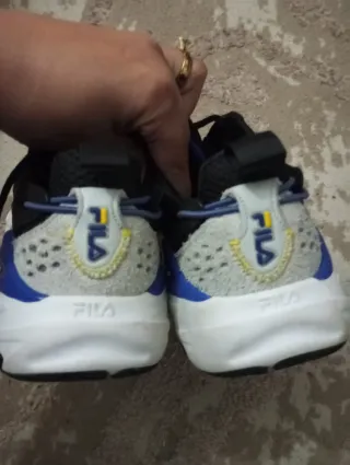 Zapatillas deportivas Fila en talla 45. Combinan blanco y azul con detalles llamativos. - Diseño moderno y deportivo. - Materiales transpirables para mayor comodidad. - Tienen una pequeña mancha en una de ellas pero se puede quitar