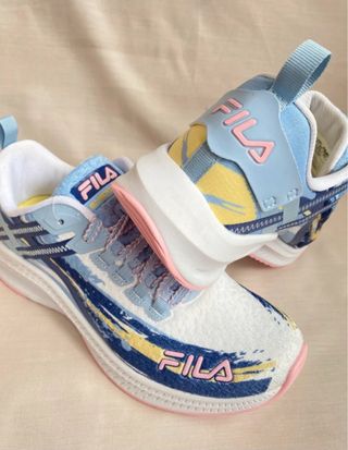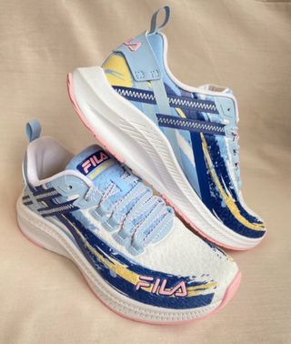 Zapatillas deportivas con un diseño moderno y llamativo. Tallas disponibles 37-38-39-40-41 - Combinación de colores azul y blanco. - Detalle de estampado abstracto. - Logo de la marca Fila en color rosa.