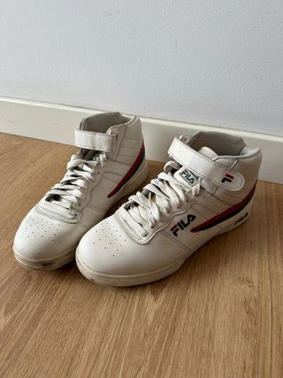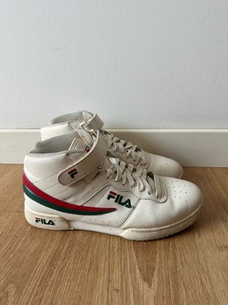 Zapatillas altas de la marca Fila en color blanco con detalles en rojo y verde. - Cierre con cordones y velcro. - Diseño deportivo. - Logo de Fila en el lateral y la lengüeta.