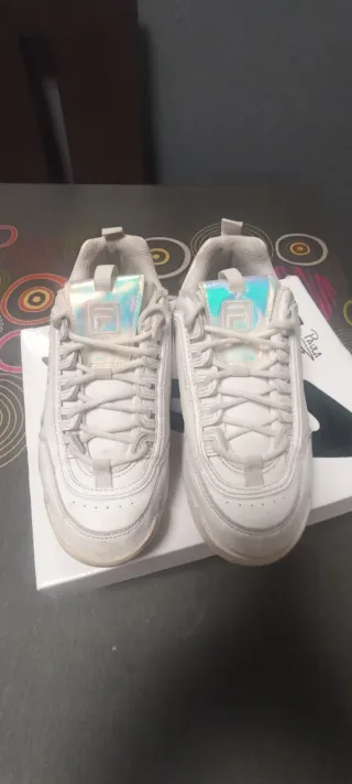 Zapatillas deportivas Fila en talla 31. - Diseño en blanco con detalles plateados brillantes. - Cierre con cordones. - Tirador trasero para facilitar su puesta. 👟 Zapatillas FILA blancas con detalles iridiscentes – Talla 31 Vendo zapatillas FILA originales en color blanco con detalles iridiscentes muy bonitas. 📏 Talla: 31 🎨 Color: Blanco con detalles holográficos 👧 Uso: Infantil 👟 Estado: Usadas, en buen estado general (ver fotos reales) Presentan desgaste normal de uso, especialmente en la puntera y suela, pero siguen siendo cómodas y funcionales. 📦 Entrega en mano o envío por Wallapop.