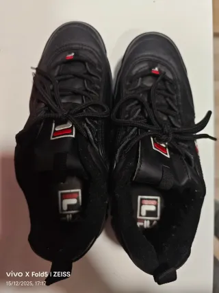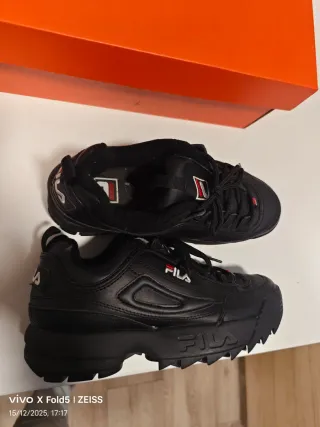 Sin uso, solo probadas Zapatillas Fila Disrupter II en color negro. Un clásico de la moda urbana. - Diseño robusto y moderno. - Logo de Fila en la lengüeta y el lateral. - Suela gruesa característica.