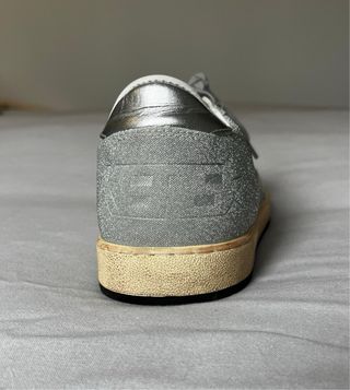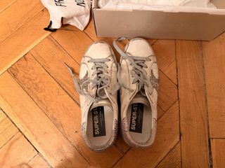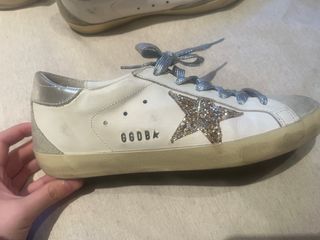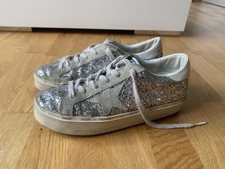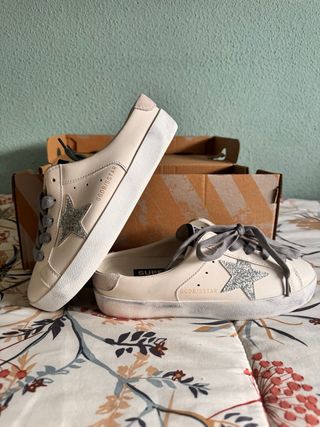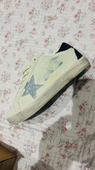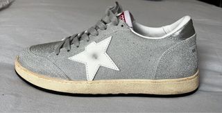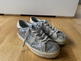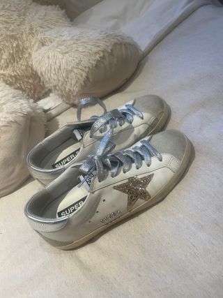 Zapatillas de la marca Golden Goose con un diseño brillante. - Exterior con purpurina plateada. - Paneles de ante en color hielo. - Cordones color gris hielo. - Detalle de estrella lateral en ante. - Suela de goma. - Fabricadas en Italia. - Tratamiento vintage Actualmente a la venta en tienda por 550€ Las entrego en su caja con pasaporte y funda de tela de la marca