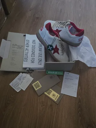 Zapatillas de la marca Golden Goose, modelo Stardan. - Combinación de colores rojo y blanco. - Diseño con estrella. - Cordones rojos. - Suela de goma. - Artículo original, nuevo a estrenar. - Incluye caja, bolsa guardapolvo y Golden Passport.