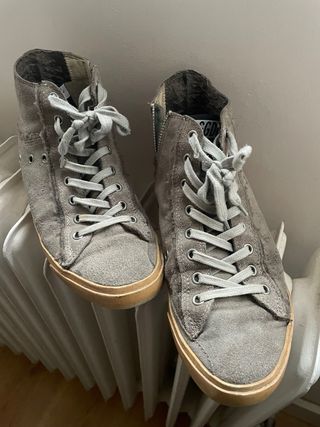 Zapatillas deportivas de la marca Golden Goose. - Practicamente Nuevos, menos de 5 usos. - Diseño de estrella blanca. - Cordones grises. - Detalle de salpicaduras negras en la puntera de una zapatilla. - Logo de la marca en la plantilla.