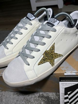 Zapatillas Golden Goose Superstar en talla 39. Un diseño icónico con detalles que marcan la diferencia. - Exterior de piel blanca. - Estrella lateral en glitter dorado. - Detalle trasero en glitter negro. - Cordones grises. - Suela con efecto desgastado.