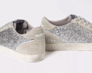 Zapatillas de la marca Brownie estilo Golden Goose con un diseño llamativo. - Acabado brillante en color plata. - Detalles en ante color beige. - Cordones a juego #goldengoose #brillo #tendencia