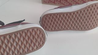 Zapatillas Vans de color granate con detalles en blanco. Modelo sin cordones y con tachuelas decorativas. - Talla 37.5. - Diseño moderno y llamativo.
