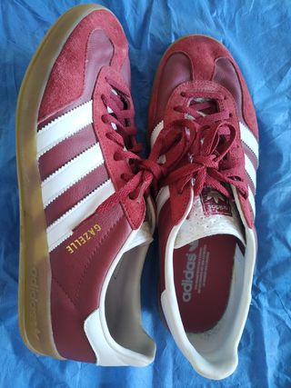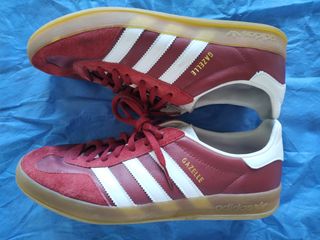 Adidas Gazelle Indoor, en piel color granate. En buen estado. Talla 42 (UK 8 1/2). Precio ya rebajado. La derecha tiene un poco despegado, no afecta nada a la zapatilla. Ver foto.