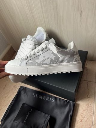 Zapatillas de la marca Numeris con un diseño moderno. - Combinación de colores gris y blanco. - Suela con plataforma. - Incluye bolsa de tela y cordones extra.