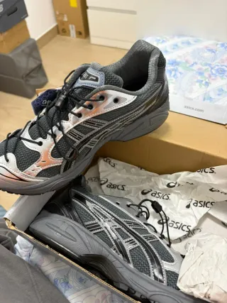 Zapatillas deportivas Asics con un diseño moderno y detalles llamativos. - Combinación de colores gris y plateado. - Materiales de malla y sintéticos.