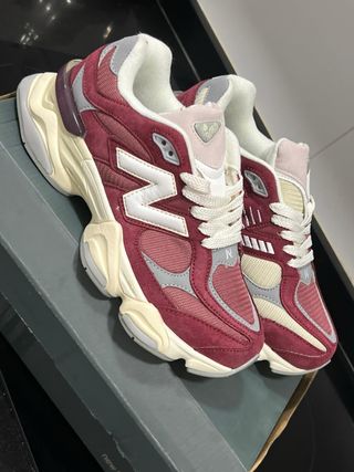 Zapatillas New Balance 9060 en color borgoña y detalles en gris y crema. - Diseño moderno y llamativo. - Logo 'N' en blanco en los laterales. - Cordones blancos. - Suela gruesa y cómoda.