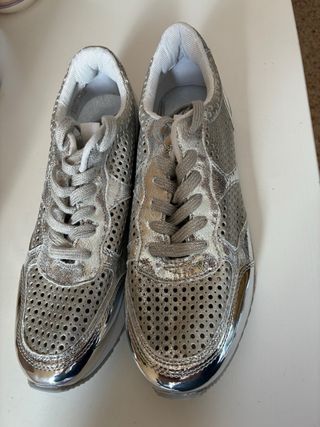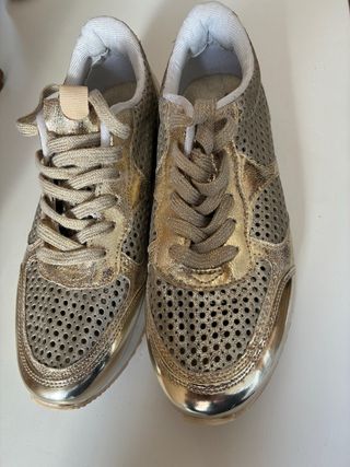 5 pares de zapatillas nuevas. Doradas, plateadas, lentejuelas rosa, brillantitos gris y rosa palo tipo golf