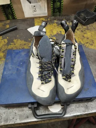 Zapatillas de escalada Boreal Spider. - Material exterior de piel. - Cierre con cordones. - Suela de goma. - Diseño en beige y gris.