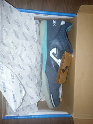 Zapatillas de futsal Joma Top Flex en color gris y turquesa. Diseñadas para ofrecer comodidad y rendimiento en la cancha. - Parte superior de cuero sintético. - Suela de goma duradera. - Diseño moderno y funcional. -Poco usadas están en la caja con sus etiquetas