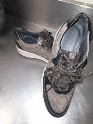 Zapatillas de la marca Stonefly en talla 39. Combinan tonos marrones con detalles brillantes. - Cierre con cordones. - Detalle de cremallera lateral. - Suela de goma.